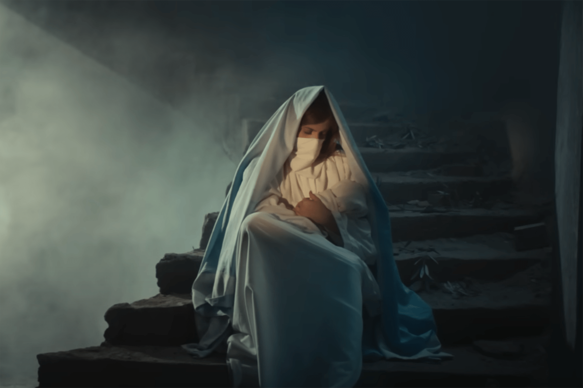 هكذا يتداعى كل واقع مألوف ويتبدل إلى آخر شرس في الحرب فتضم أُمٌّ طفلها محاولة النجاة به، في تجسيد لـ”العذراء وعيسى”. يحكي رضوان خلطه بين العملين في ذلك المشهد، سالبا شكلا من العمل المنحوت وتصميم المرسوم، لما فيهما من رمزية مساع السيدة مريم للهروب بعيسى -عليه السلام- وهو في المهد من المذابح التي كان يقيمها الرومان على الأطفال، إذ يؤمن رضوان بمصير الأطفال الفلسطينيين والرومانيين المتشابك بالرغم من تعاقب الأزمنة، ولا سيما أن اليهود هم من سلموا المسيح للرومان الذين صلبوه.