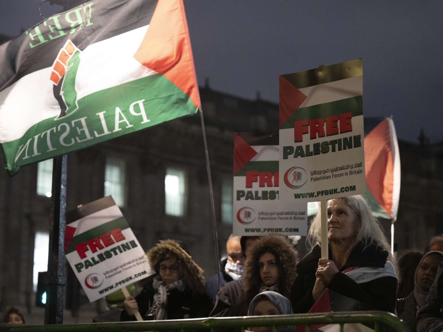 وتجمع متظاهرون مناهضون للحرب الإسرائيلية على غزة حاملين الأعلام الفلسطينية خارج المبنى وسط لندن أمس الخميس للاحتجاج على تنظيم الفعالية التي هدفت لتشجيع الاستثمارات في الشركات الإسرائيلية الناشئة.