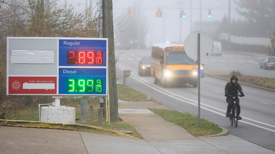 أحد الركاب في الصباح يركب دراجة هوائية بالقرب من لافتة أسعار محطة الوقود في شارع ويست ثيرد في ظل هطول أمطار ضبابية في 21 نوفمبر 2025، في بلومنجتون، إنديانا. (جيريمي هوجان / غيتي إيماجز / غيتي إيماجز)