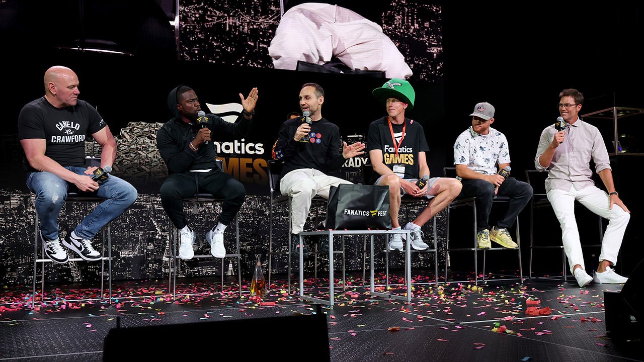 من اليسار، دانا وايت، وكيفن هارت، ومايكل روبين، ومات دينيش، وجاستن جايتجي، وتوم برادي يتحدثون على خشبة المسرح خلال مهرجان المتعصبين NYC 2025 في مركز جافيتس في 22 يونيو 2025، في مدينة نيويورك. (كيفن مازور / غيتي إيماجز)