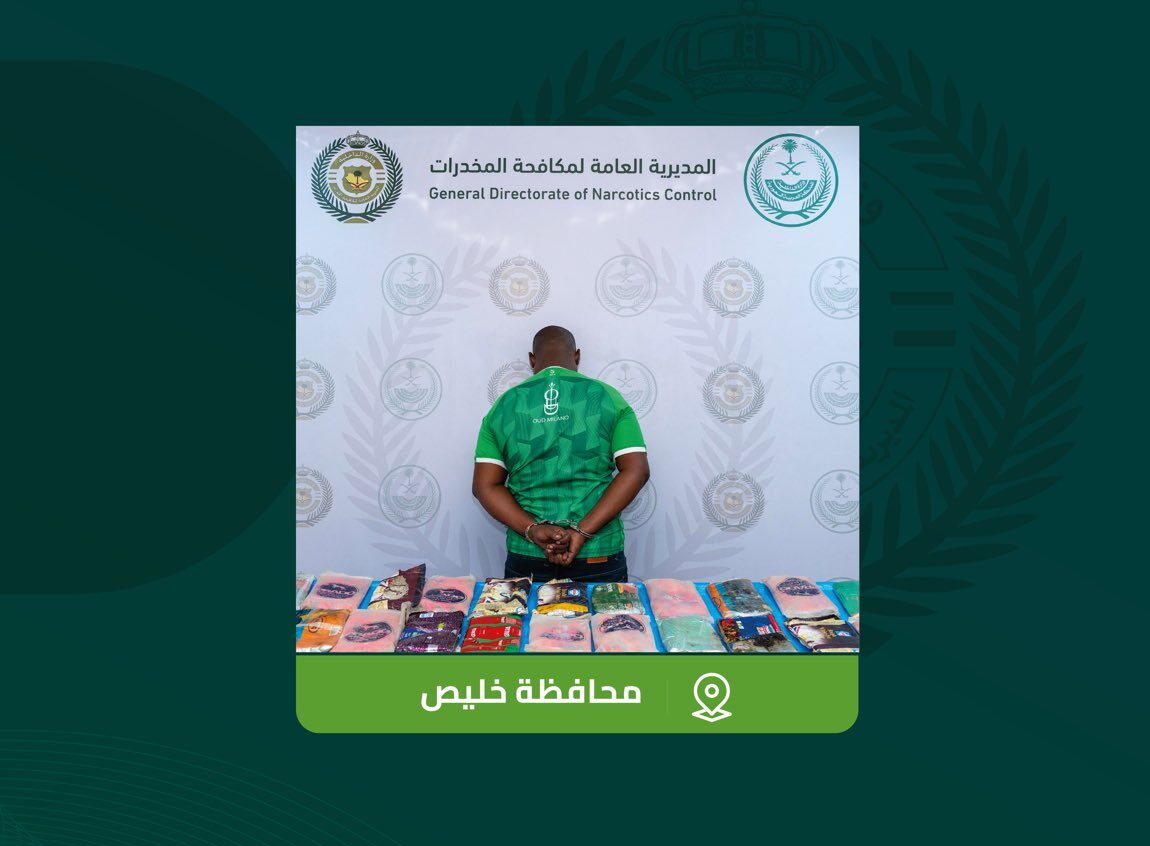 قبضت المديرية العامة لمكافحة المخدرات على مقيم من الجنسية الكينية بمحافظة خليص لترويجه (23) كيلوجرامًا من مادة الحشيش المخدر، وجرى إيقافه واتخاذ الإجراءات النظامية بحقه، وإحالته إلى النيابة.