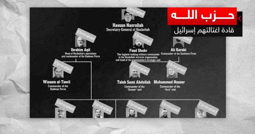 وإلى جانب نصر الله، اغتالت إسرائيل مسؤول جبهة الجنوب في الحزب علي كركي، وإبراهيم عقيل قائد وحدة الرضوان، وفؤاد شكر الذي كان مسؤولا عن كافة عمليات الحزب الحربية، ووسام الطويل الذي تولى قبل عقيل وحدة الرضوان وهي “قوات النخبة” في حزب الله.