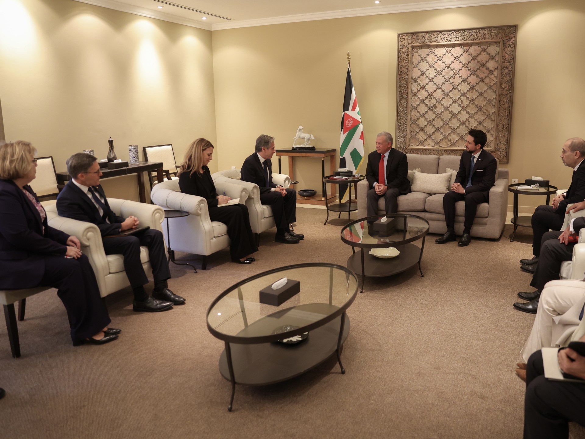 وخلال اجتماعه مع بلينكن، أكد الملك عبد الله الثاني رفض الأردن الكامل للتهجير القسري للفلسطينيين في الضفة الغربية وقطاع غزة والذي يشكل خرقا واضحا للقانون الدولي، لافتا إلى ضرورة تمكين أهالي غزة من العودة إلى بيوتهم.