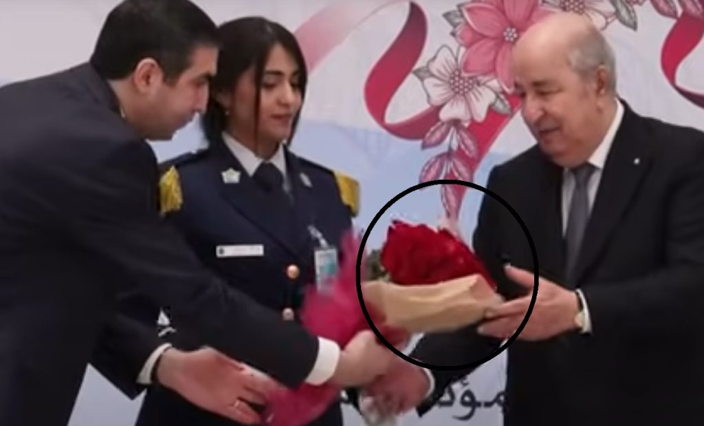 ويظهر الفيديو الرئيس الجزائري خلال ما يبدو أنّه حفلٌ تكريميّ وهو يسلّم باقات من الورد لمجموعة من النساء، وجاء في التعليق المرافق للفيديو أنّ النساء تسلّمن باقة الورد نفسها بعد أن استعادها أحد منظّمي الحفل كما يبدو في المقطع.