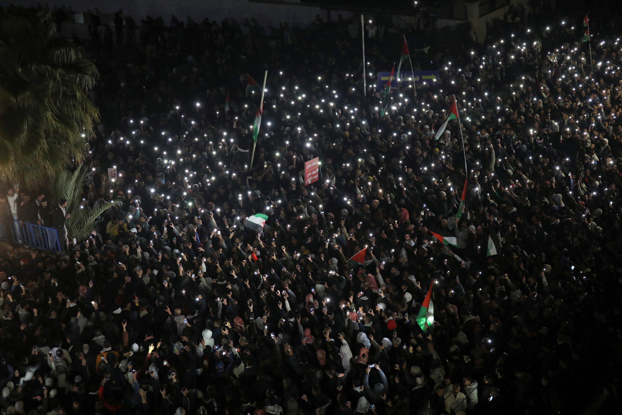وتقول السلطات في الأردن إن الاحتجاجات السلمية مسموح بها، لكنها لن تتسامح مع أي محاولة ممن يسعون إلى استغلال الغضب ضد إسرائيل لإحداث الفوضى أو محاولة الوصول إلى منطقة حدودية مع الضفة الغربية المحتلة أو إسرائيل.