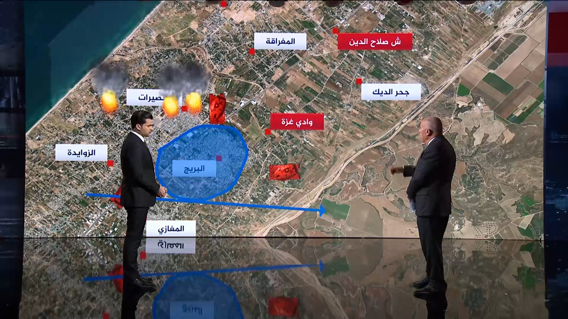 وبسبب قوة المواجهة، عمدت إسرائيل إلى تكتيك إضافي لتشتيت المقاومة أملا في الوصول إلى طريق صلاح الدين، فأرسلت فرقة إلى شمال النصيرات لعمل إحاطة تتجاوز الزوايدة إلى أطراف دير البلح، وفق الدويري.