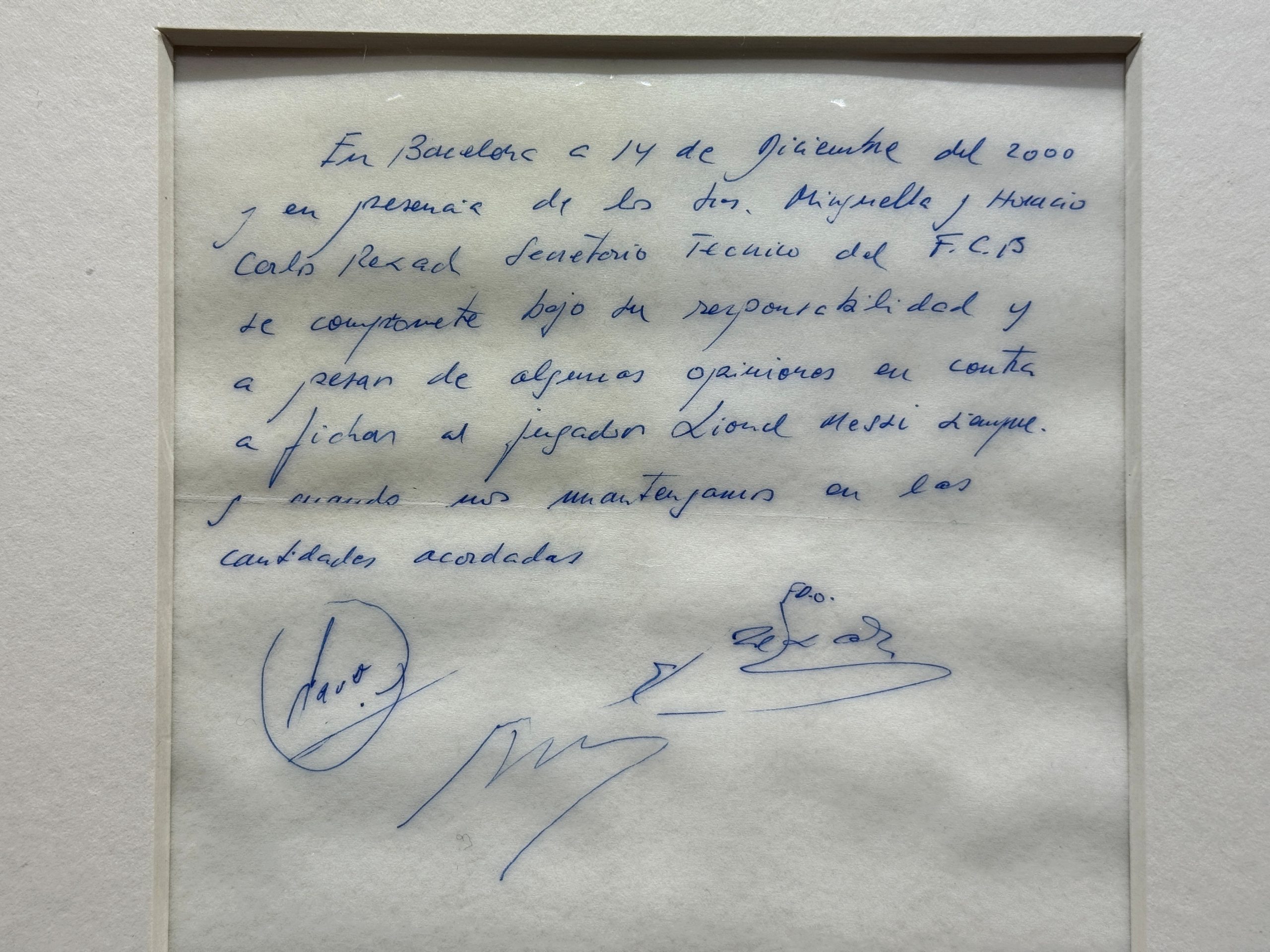 وكتب على المنديل الخاص بنادي بومبيا للتنس “إنه في 14 ديسمبر 2000، في برشلونة وبحضور السادة مينجيلا وهوراسيو، وافق كارليس ريشاك، المدير الرياضي لنادي برشلونة، وتحت مسؤوليته وبغض النظر عن أي آراء مخالفة، على التوقيع مع اللاعب ليونيل ميسي بشرط أن يتم ذلك بالمبالغ المتفق عليها”.