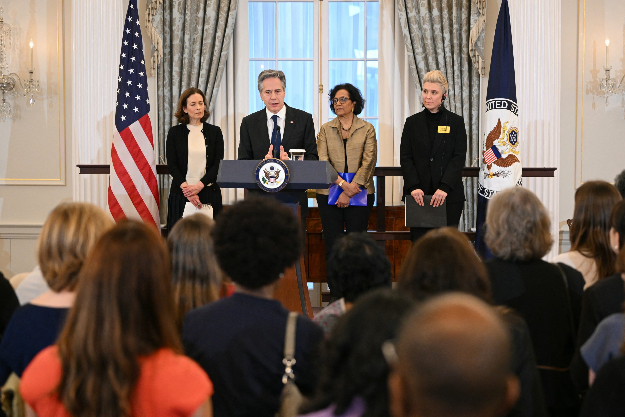 وفي حفل أقيم بمقر وزارة الخارجية الأميركية بمناسبة يوم المرأة العالمي، قال بلينكن: “نعمل على إتاحة الفرص للنساء والفتيات في عمليات صنع القرار”.