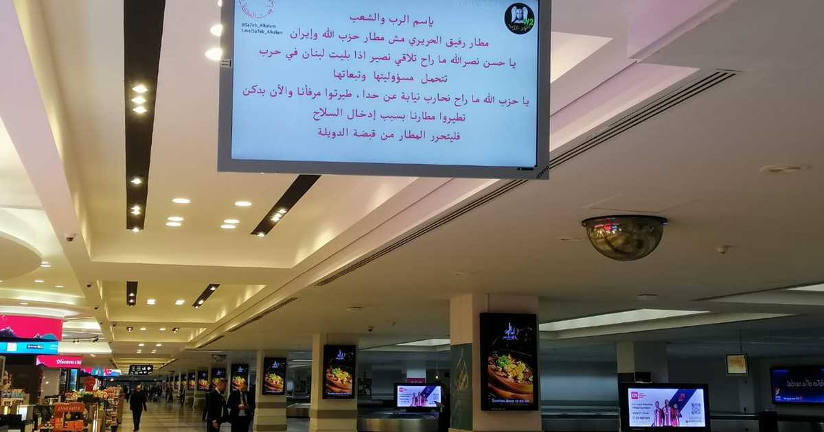 واستبدلت معلومات المغادرة والوصول التي تعرضها الشاشات برسالة تتهم حزب الله بتعريض لبنان لخطر خوض حرب شاملة مع إسرائيل.