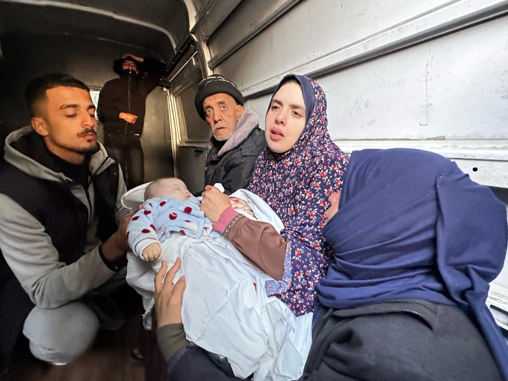 ثم يظهر رجل ثان، وهو يحمل جثمان طفل رضيع آخر ويصرخ “4 أشهر.. عمره 4 أشهر”، وإلى جواره أشخاص آخرون يبكون ذويهم وأقاربهم الذين قضوا في القصف الإسرائيلي.