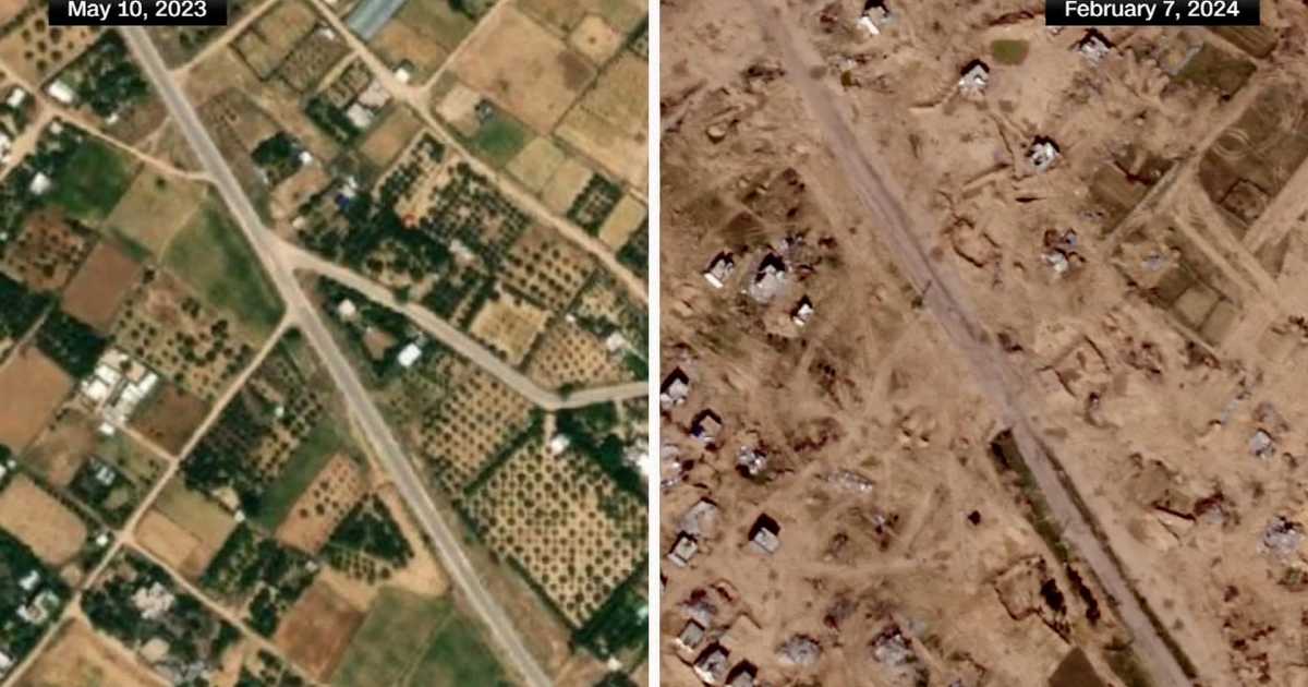 واستعان بصورتين لمنطقة زراعية في غزة، حملت الأولى تاريخ 10 مايو 2023 والثانية 7 فبراير 2024، لكشف حجم الدمار الذي لحق بها.