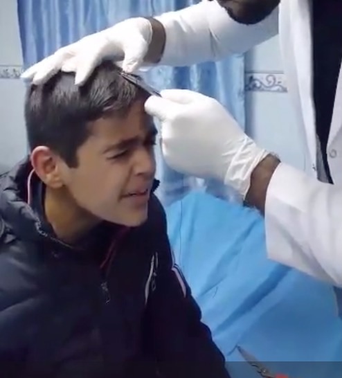 وجاء في التفاصيل أن الطفل من مدينة العمارة العراقية وقد أصيب بضربة في رأسه واضطر إلى خياطة الجرح بدون تخدير نظرا لعدم توفره في المستشفى.