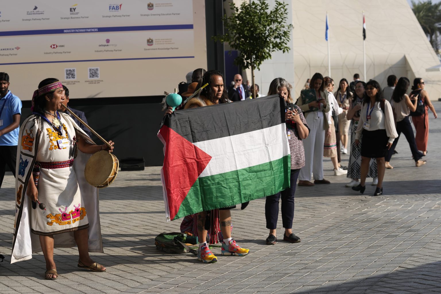 انتقادات سلوك إسرائيل في الحرب تخللت معظم فترات قمة المناخ من جانب زعماء العالم، فضلا عن النشطاء الذين يمكن رؤيتهم من خلال الموقع وهم يرتدون الوشاح الفلسطيني التقليدي.