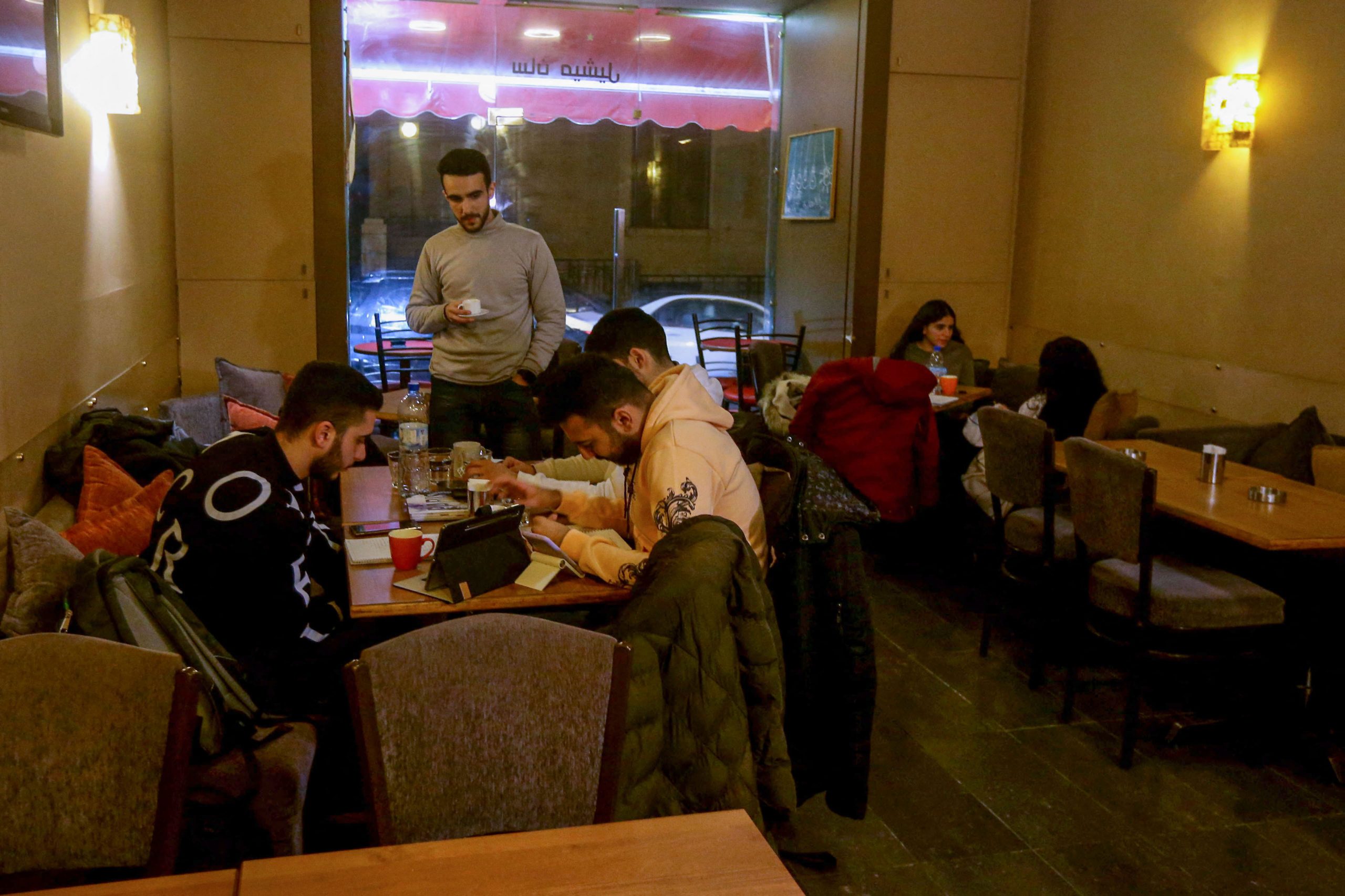 وفي منطقة باب توما المعروفة بحاناتها ومقاهيها في شرق دمشق، تحول مقهى إلى قاعة دراسة يسودها الهدوء.