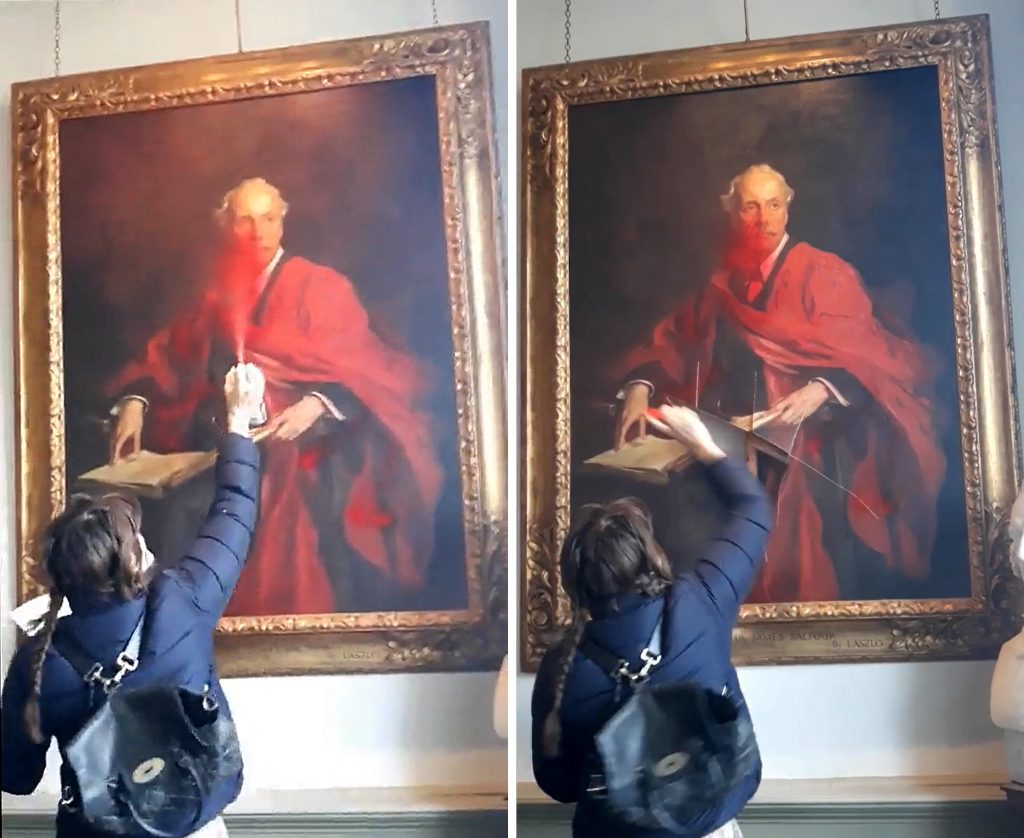 ونشرت مجموعة “Palestine Action” مقطع فيديو لمتظاهرة قامت أولاً برش اللوحة، التي رسمها فيليب ألكسيوس دي لازلو عام 1914، بالطلاء الأحمر ثم قامت بتقطيعها بأداة حادة.