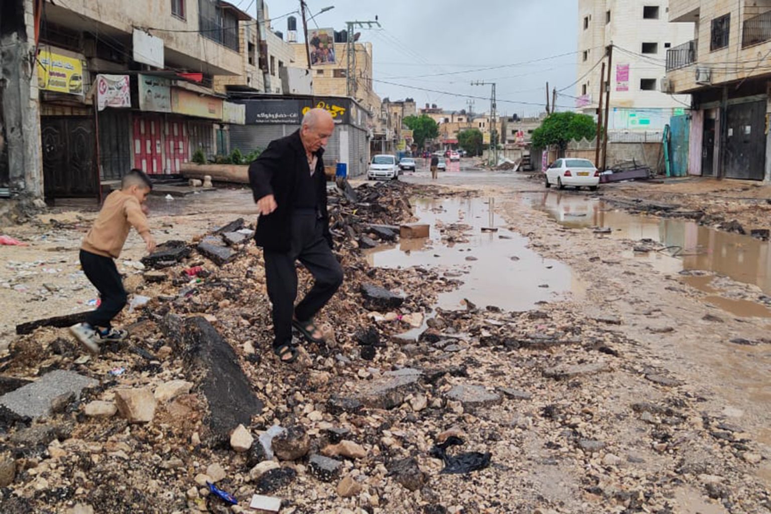يقول أبو جهاد “اليوم نزلت الأمطار، فتعسرت الحركة بشكل أكبر، وبرك المياه منتشرة في الشوارع المجرفة، وصعّب الأمر تدمير شبكات الصرف الصحي التي تسبب في خروجها إلى الشوارع، نحن نسير على المياه العادمة”.