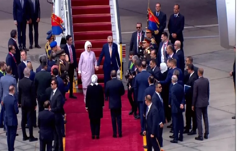 وصل الرئيس التركي رجب طيب أردوغان وقرينته أمينة أردوغان إلى القاهرة، اليوم الأربعاء، وكان في استقبالهما الرئيس عبدالفتاح السيسي وقرينته انتصار السيسي.