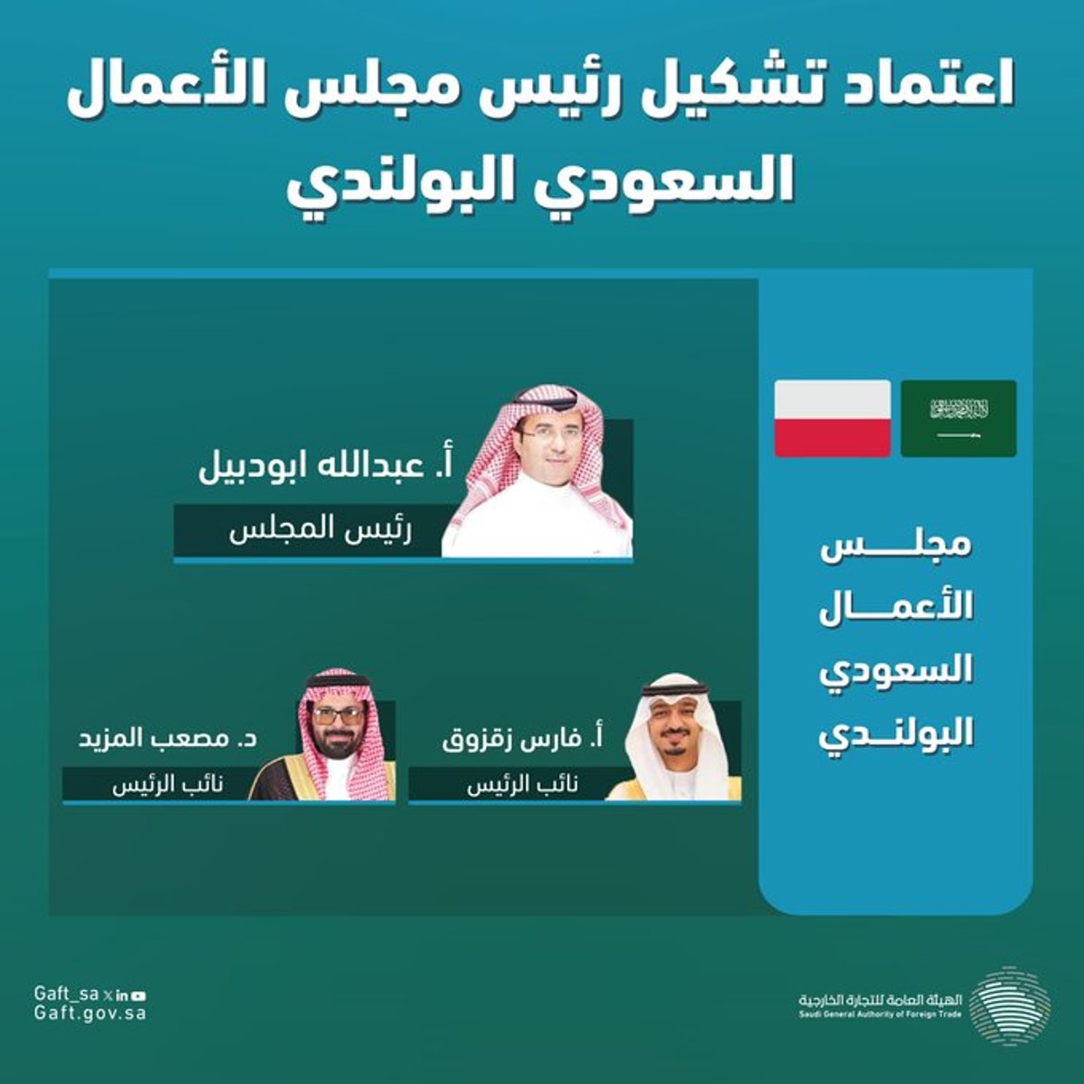 وتم ترشيح عبدالله بن محمد أبو دبيل رئيسًا لمجلس الأعمال السعودي البولندي ورئيسًا للجنة التنفيذية، وكل من فارس بن حازم زقزوق، ومصعب بن أحمد المزيد نائبين للرئيس ونائبين لرئيس اللجنة التنفيذية.