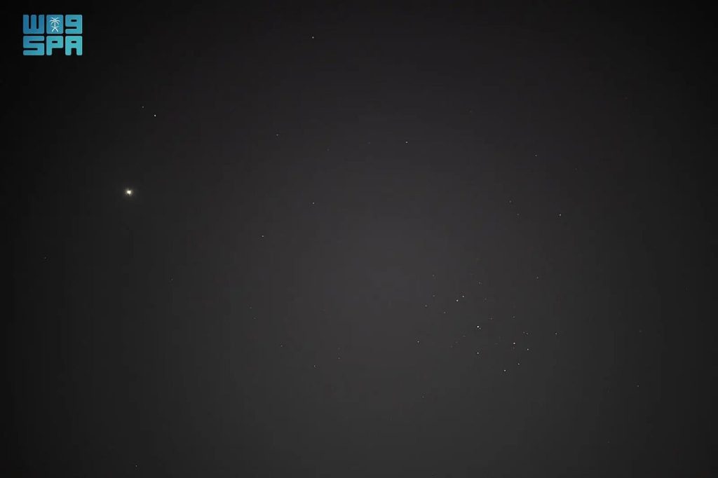 ويبدو كوكب الزهرة، المعروف بلمعانه الشديد، قريبًا بصريًّا من عنقود الثريا، أحد أشهر العناقيد النجمية المفتوحة التي تُرى بالعين المجردة، في مشهدٍ يعكس جمال السماء الصافية التي تتميز بها المنطقة خلال هذه الفترة.