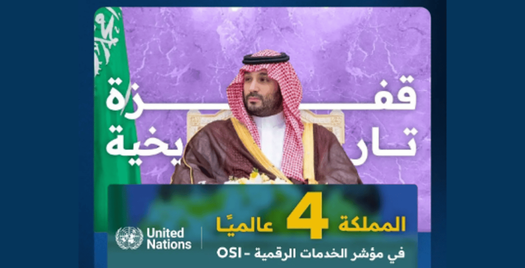 قفزت المملكة العربية السعودية (25) مرتبة في مؤشر الأمم المتحدة لتطور الحكومة الإلكترونية 2024، لتكون ضمن مجموعة الدول الرائدة على مستوى العالم، وحققت المركز (الرابع) عالمياً و(الأول) إقليمياً و(الثاني) على دول مجموعة العشرين في مؤشر الخدمات الرقمية، بالإضافة إلى تحقيق المركز (السابع) في مؤشر المشاركة الإلكترونية، كما حققت مدينة الرياض المركز (الثالث) من بين (193) مدينة حول العالم.