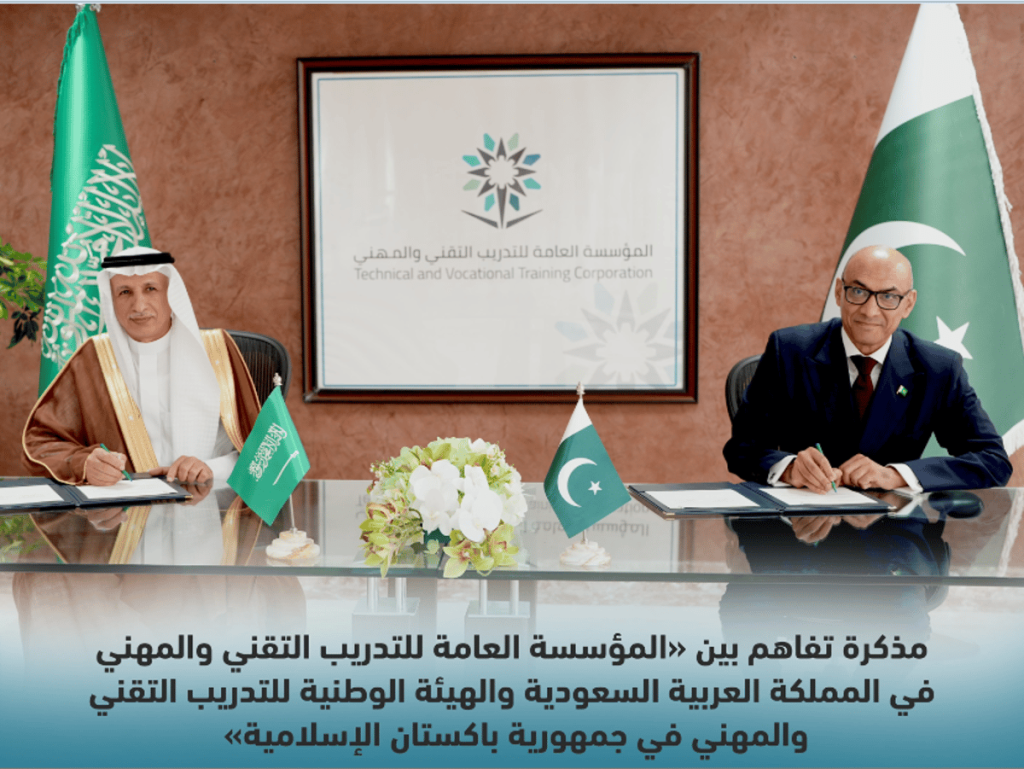 وقعت المؤسسة العامة للتدريب التقني والمهني ممثلة بنائب المحافظ لسياسات التدريب والجودة، د. عبد الله آل مرزوق، وسفير جمهورية باكستان لدى المملكة، أ. أحمد فاروق، مذكرة تفاهم مع الهيئة الوطنية للتدريب التقني والمهني في جمهورية باكستان الإسلامية.