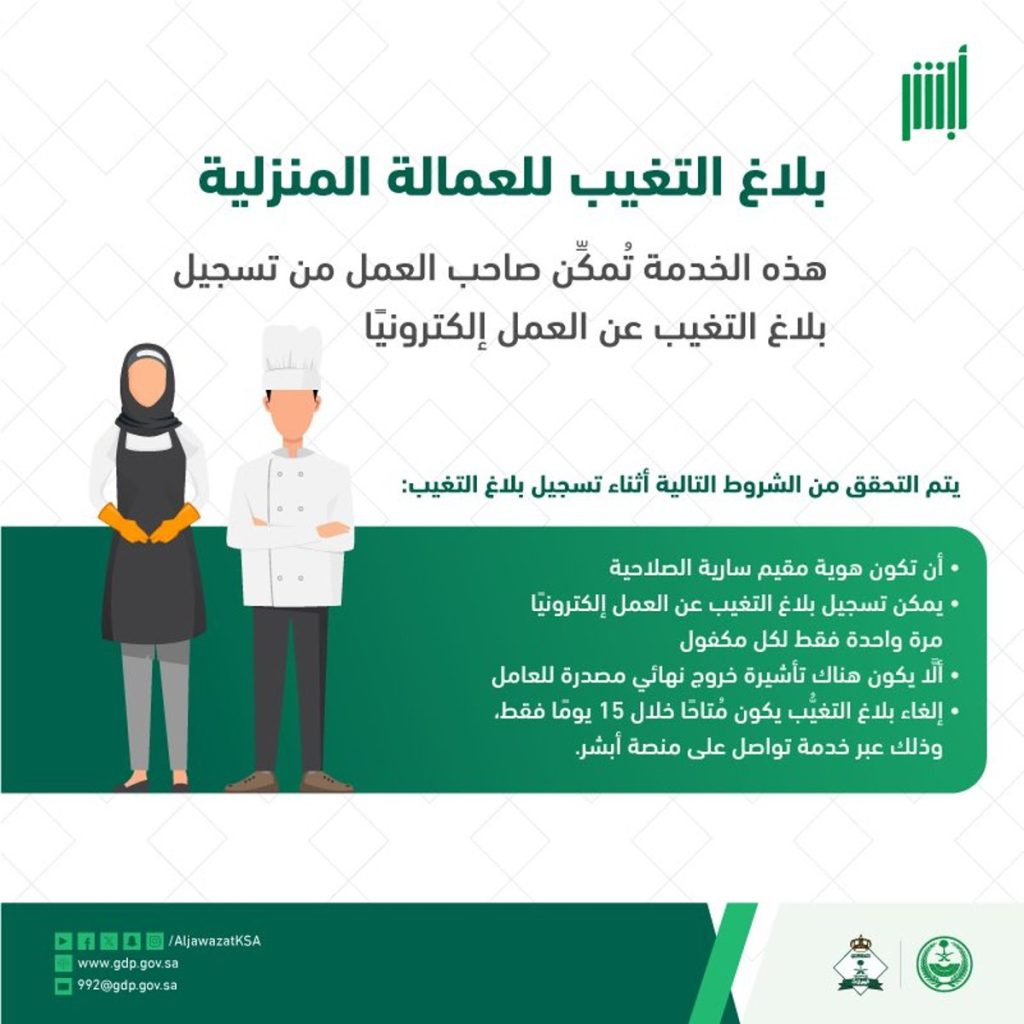 قالت المديرية العامة للجوازات، إنه «لا يمكن إلغاء بلاغ التغيب للعمالة المنزلية بعد مرور 15 يومًا من تاريخ البلاغ».
