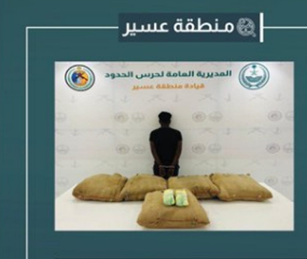 قبضت الدوريات البرية لحرس الحدود في قطاع الربوعة بمنطقة عسير تقبض على مخالف لنظام أمن الحدود من الجنسية الإثيوبية لتهريبه (110) كيلوجرامات من نبات القات المخدر.
