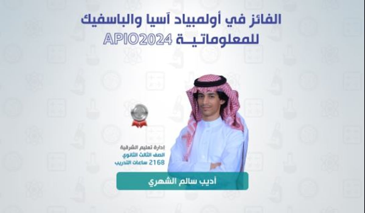 وحقق الطالب أديب سالم الشهري، من الصف الثالث الثانوي من إدارة تعليم الشرقية الميدالية الفضية، التي تعد الفضية الأولى لمنتخب المعلوماتية السعودي في هذه المسابقة، حيث سبق له تحقيق 3 برونزيات في المشاركات السابقة، وتعد من المسابقات الصعبة التي تعتمد عليها العديد من الدول، لاختيار الفريق المشارك في مسابقة الأولمبياد الدولي للمعلوماتية.