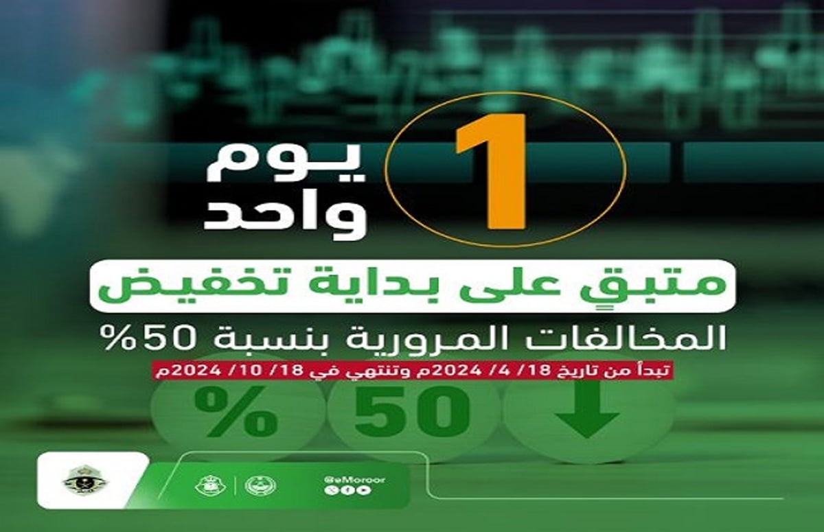 يوم واحد متبقٍ على بداية تطبيق تخفيض المخالفات المرورية بنسبة 50%؛ لسداد المخالفات المرورية المتراكمة قبل تاريخ 18/ 04/ 2024م، بهدف تعزيز السلامة المرورية والحد من الحوادث في طرق المملكة.