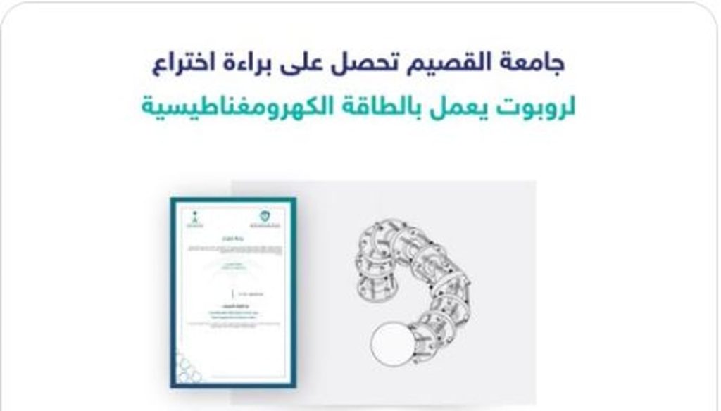 حصلت جامعة القصيم، على وثيقة براءة اختراع من الهيئة السعودية للملكية الفكرية، عن ابتکار روبوت متسلسل يمكن تشغيله بالطاقة الكهرومغناطيسية، عوضا عن الطرق الاعتيادية لتشغيل الروبوت، ويمكن استخدامه في عدد من المجالات الصناعية وتطبيقات الروبوت.