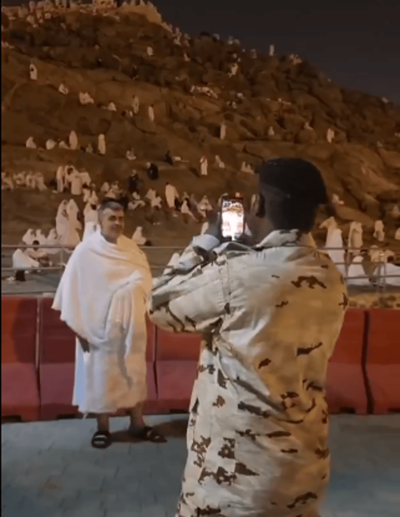 استعان عدد من ضيوف الرحمن برجل أمن لالتقاط الصور التذكارية بالقرب من جبل الرحمة في عرفات.