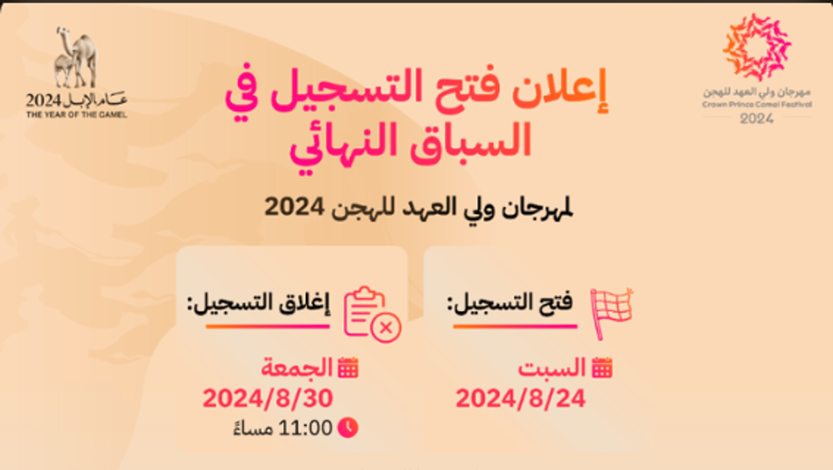 أعلنت اللجنة المنظمة لمهرجان ولي العهد للهجن، موعد تسجيل ملاك الهجن في أشواط المرحلة النهائية ضمن المرحلة السادسة للمهرجان، إذ سيكون التسجيل متاحًا خلال الفترة من 24 – 30 أغسطس الجاري، وذلك عبر مواقع التواصل الاجتماعي في منصات الاتحاد السعودي للهجن واللجنة المنظمة.