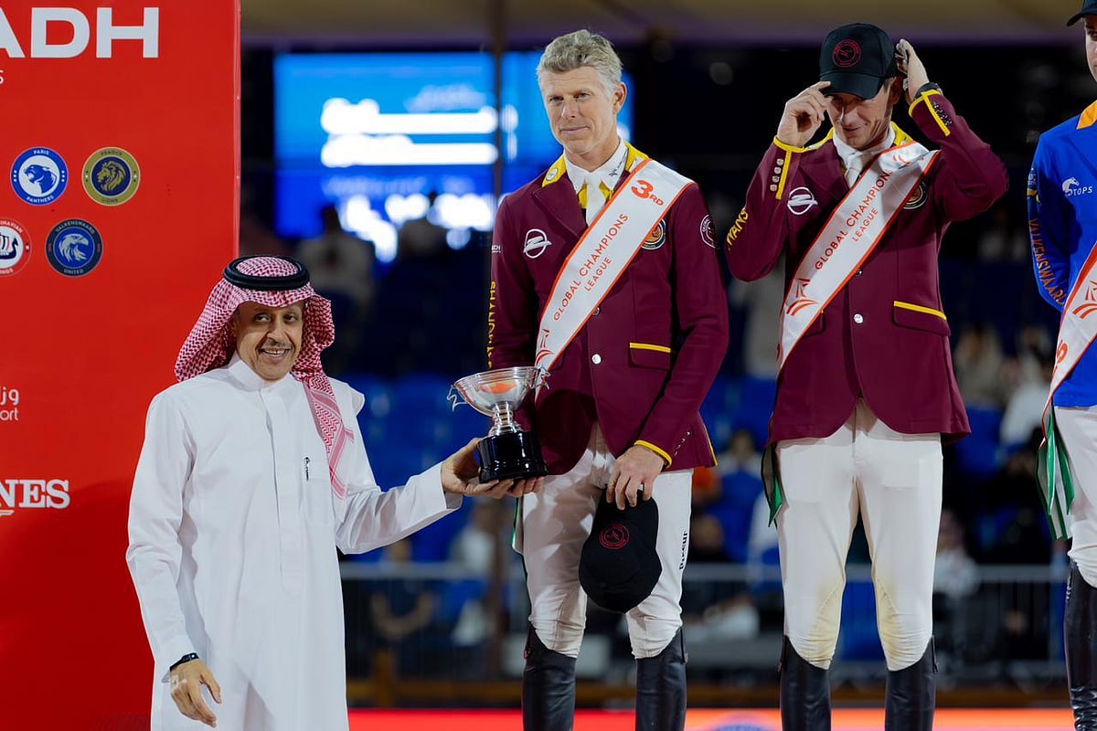 كما سلم معالي مساعد وزير الرياضة الأستاذ عبدالإله، والسيد يان توبس رئيس جولات لونجين العالمية لأبطال قفز الحواجز ودوري الأبطال العالمي جائزتي المركز الثاني والثالث، لفريقي كانز ستارز وشنغهاي سوانز.