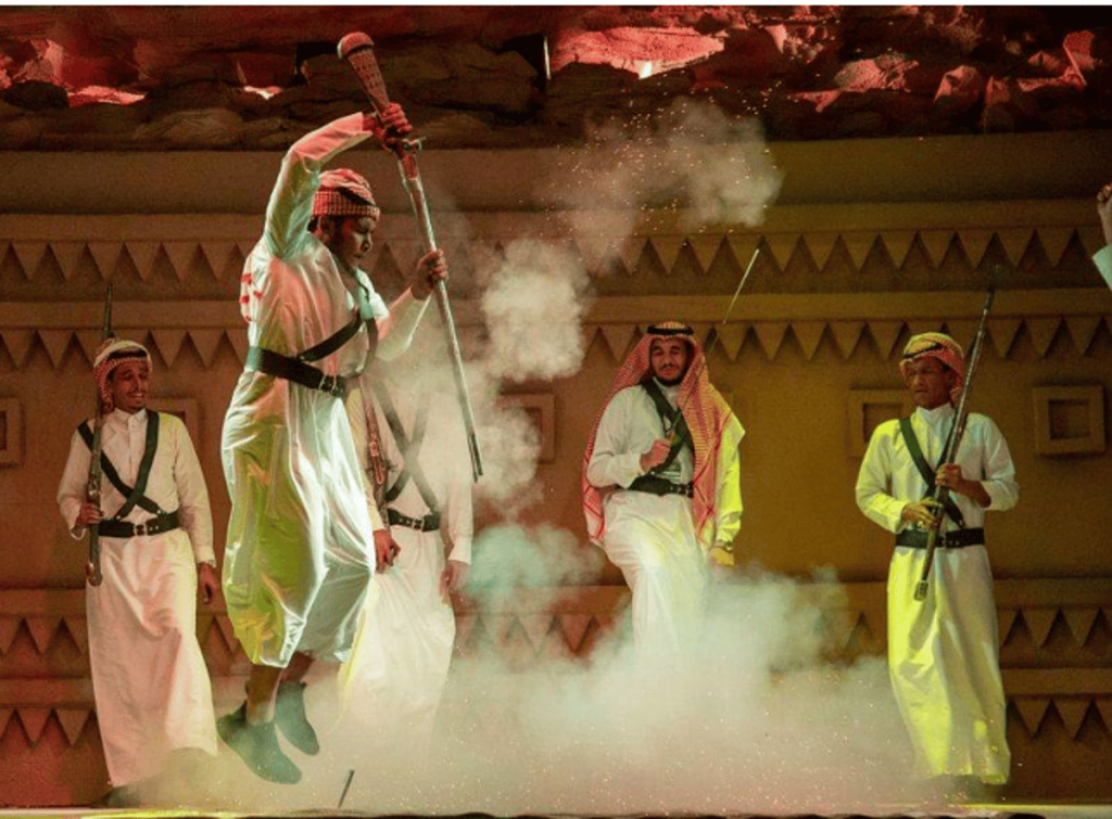 وأشار إلى أن فن “التعشير” يؤدى من خلال شخص أو شخصين أو أكثر في وقت واحد، يداعب فيها العارض “المقمع”، الذي يكون محشواً بالبارود ليتحول إلى لهب تحت قدميه بعد ضغطه على الزناد والوثب عالياً ليعانق بعدها العارض السماء واللهب.