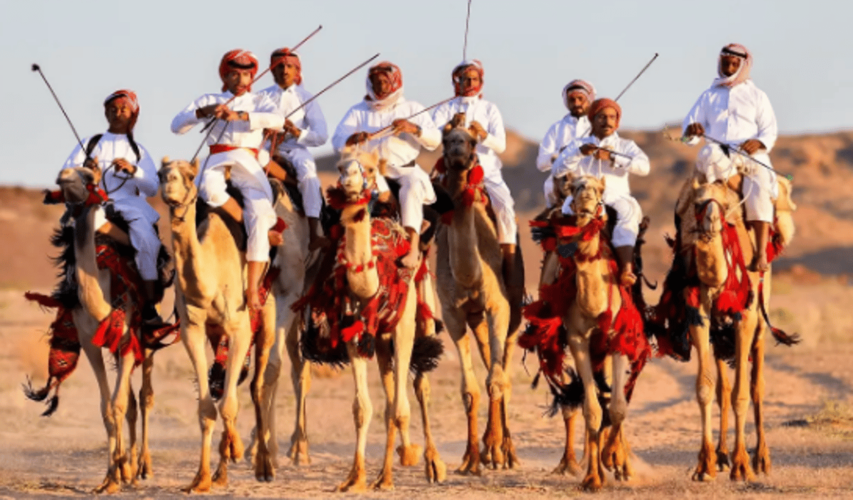 وتتسم مباهج العيد لدى سكان بادية تبوك بعادات قل نظيرها، تنم عن الأصالة والمعاصرة والطابع الرصين، الذي اعتادوه من خلال إيقاع حياتهم المنبسطة في الصحراء، وارتباطهم بالإبل التي يزينونها وينطلقون بها في كل عيد ومناسبة، مرددين لونهم الشعبي الخاص، بعبارات يملؤها الفرح لإحياء أيام العيد.