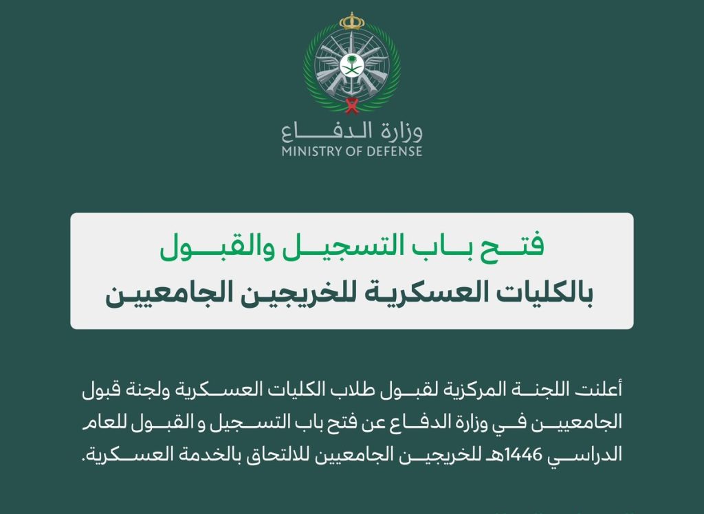 بدأ اليوم التقديم لقبول الخريجين الجامعيين في الكليات العسكرية، حيث حددت وزارة الدفاع شروط التقديم في الكليات العسكرية 1445 للخريجين ورابط ومدة التقديم.