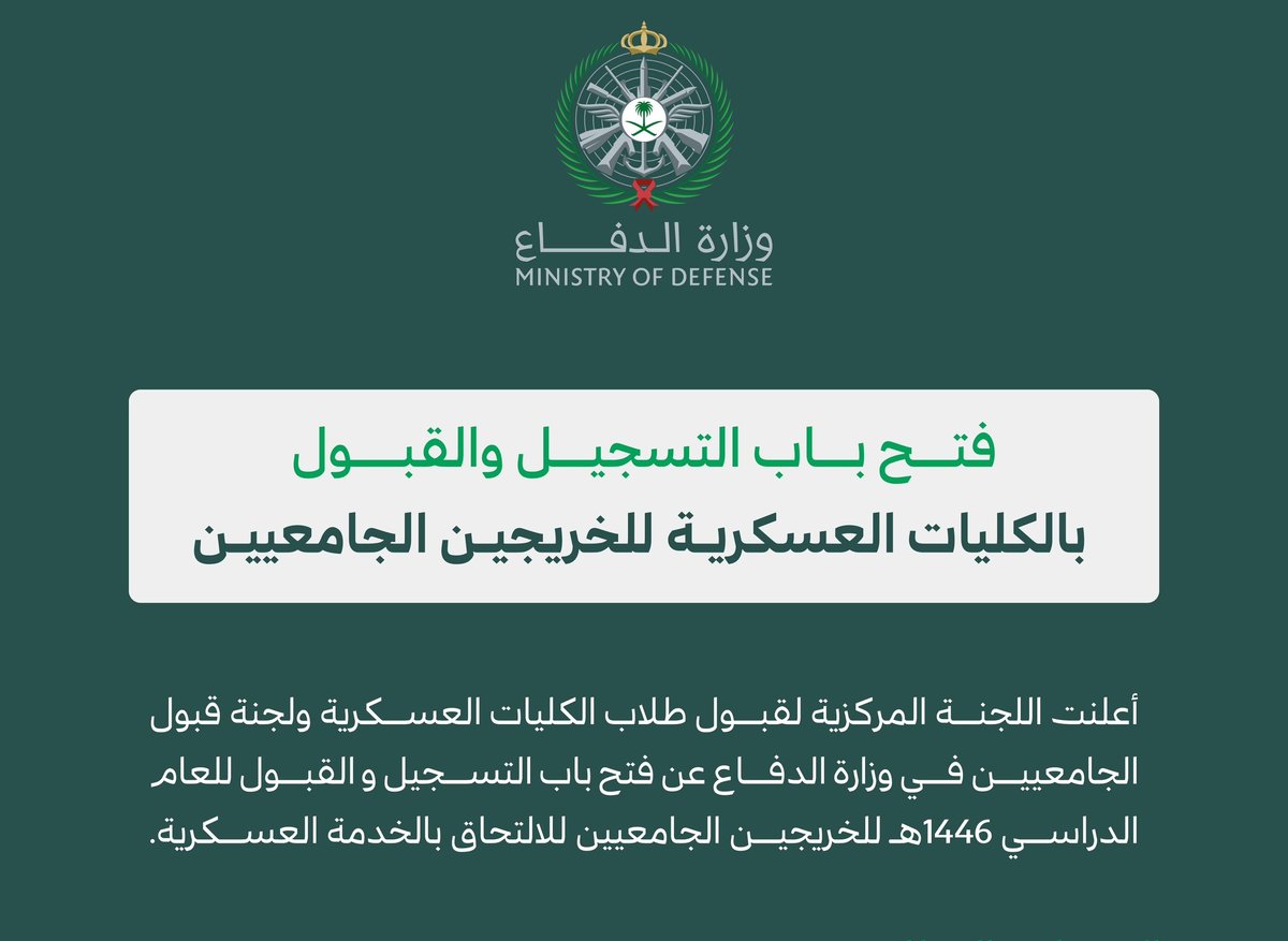 اللجنة المركزية لقبول طلاب الكليات العسكرية ولجنة قبول الجامعيين في #وزارة_الدفاع، تبدأ غدًا الأحد استقبال طلبات التسجيل والقبول في الكليات العسكرية للخريجين الجامعيين.