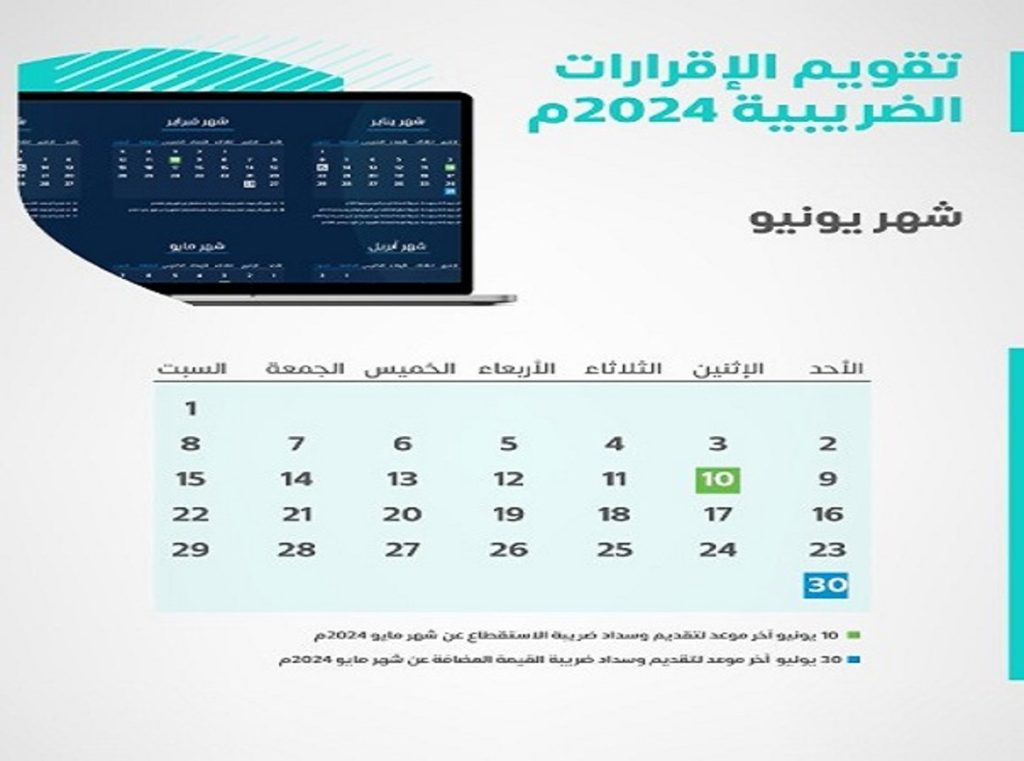 • 10 يونيو آخر موعد لتقديم وسداد ضريبة الاستقطاع عن شهر مايو 2024م