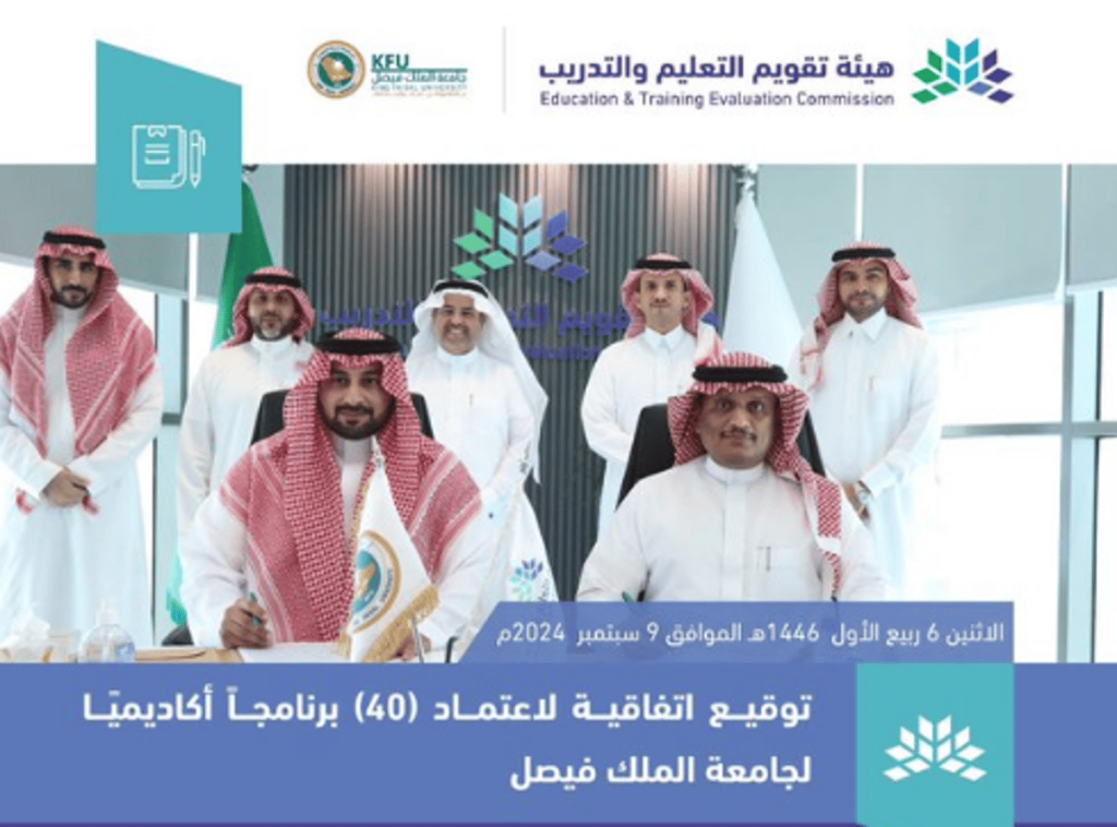 الهيئة -ممثلة بمركز اعتماد @EtecNcaaa – توقيع اتفاقية لاعتماد (40) برنامجاً أكاديميًا لجامعة الملك فيصل @KFUniversity ؛ لضمان جودة مؤسسات وبرامج التعليم العالي ومخرجاتها، ولتحقيق أهداف #رؤية_السعودية_2030، ومستهدفات برنامج تنمية القدرات البشرية.#اعتماد_الجامعات_جودة… pic.twitter.com/YFuCdsaiC3
