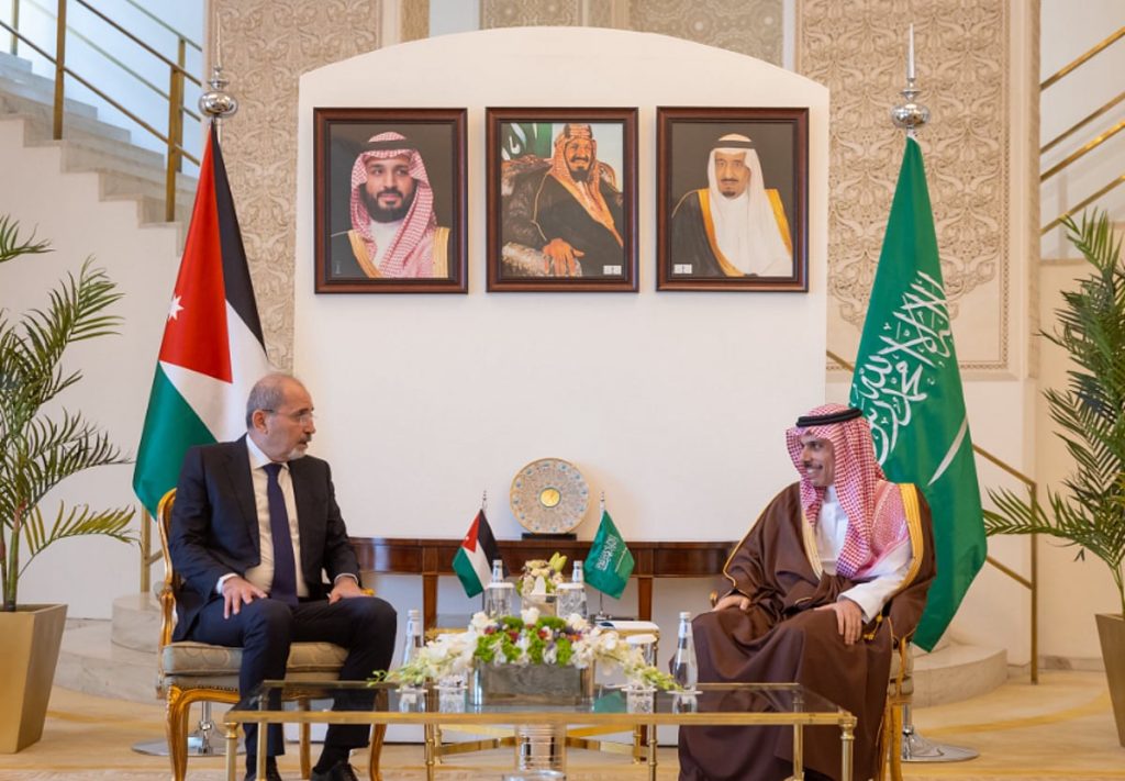 بحث الأمير فيصل بن فرحان وزير الخارجية، ونائب رئيس الوزراء ووزير الخارجية وشؤون المغتربين في المملكة الأردنية الهاشمية أيمن الصفدي، تطورات الأوضاع في سوريا وفلسطين.