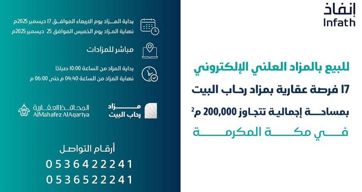 تعلن شركة المحافظ العقارية وبإشراف مركز الإسناد والتصفية «إنفاذ» بقرار من محكمة التنفيذ، عن إقامة مزاد “رحاب البيت” الإلكتروني على منصة مباشر للمزادات، حيث يبدأ المزاد يوم الأربعاء 17 ديسمبر الساعة 10 صباحاً، وينتهي يوم الخميس 25 ديسمبر الساعة 6 مساءً، وبحسب الموعد المحدد لكل عقار.