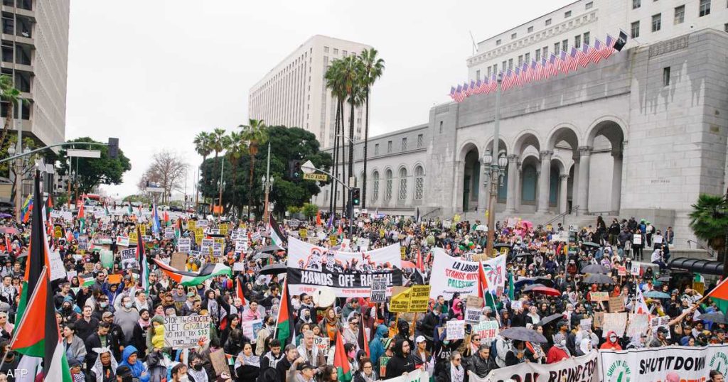 وقالت إدارة شرطة لوس أنجلوس على منصة إكس إنها تراقب المظاهرة التي لم تحصل على تصريح.