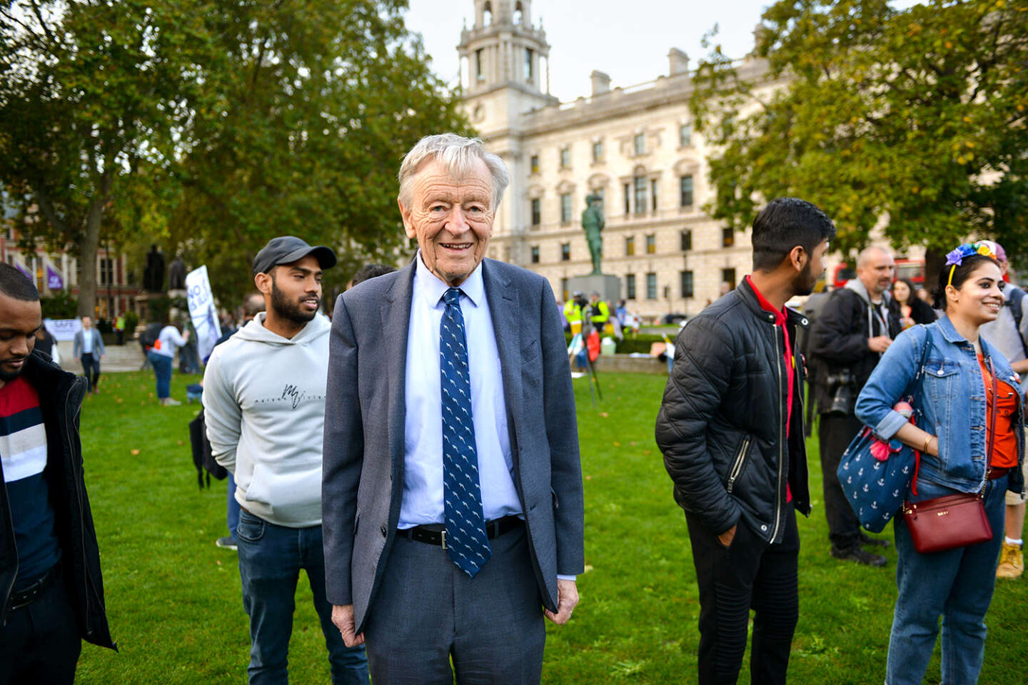 اللورد ألف دوبس يتظاهر لدعم اللاجئين، في أكتوبر 2021، في ساحة البرلمان، لندن. العلمي