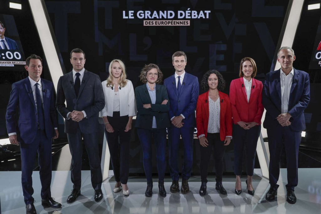 مناقشة نهائية بين ثمانية أحزاب قبل التصويت في 9 يونيو. وزعماء القائمة الثمانية الرئيسية في الانتخابات الأوروبية، ليون ديفونتين (الحزب الشيوعي)، فاليري هاير (المعسكر الرئاسي)، مانون أوبري (فرنسا الأبية)، ماري توسان (الإيكولوجيون)، جوردان بارديلا (التجمع الوطني)، فرانسوا كزافييه بيلامي. (Les Républicains)، ورافائيل جلوكسمان (الحزب الاشتراكي – المكان العام) وماريون ماريشال (Reconquête!) ناقشوا بشكل أساسي الهجرة والبيئة والحرب في أوكرانيا.