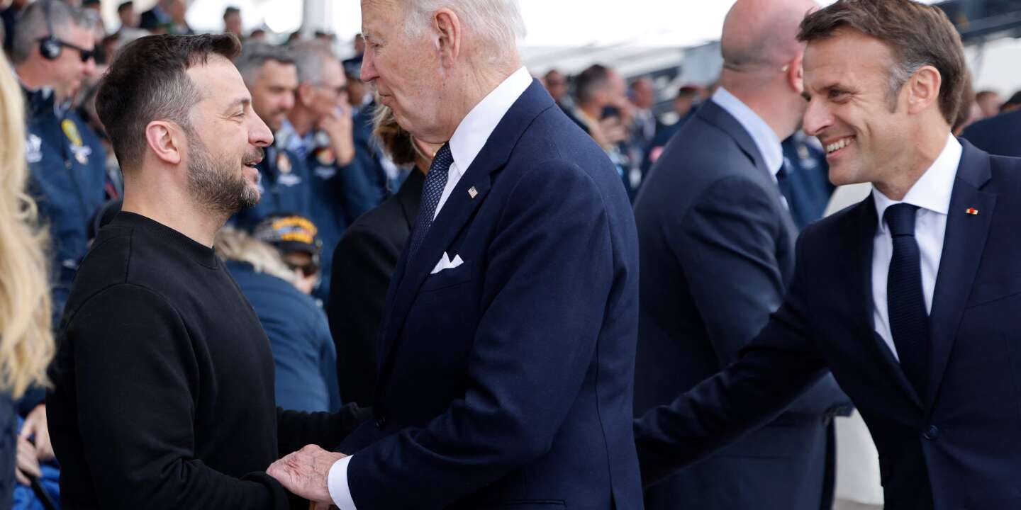 صورة الغلاف: جو بايدن (في الوسط) يصافح الرئيس الأوكراني فولوديمير زيلينسكي (يسار) بينما ينظر إيمانويل ماكرون خلال الحفل التذكاري الدولي في شاطئ أوماها بمناسبة الذكرى الثمانين لهبوط الحلفاء في نورماندي، في سان لوران سور الأربعاء، 6 يونيو ، 2024. لودوفيك مارين / أ ف ب