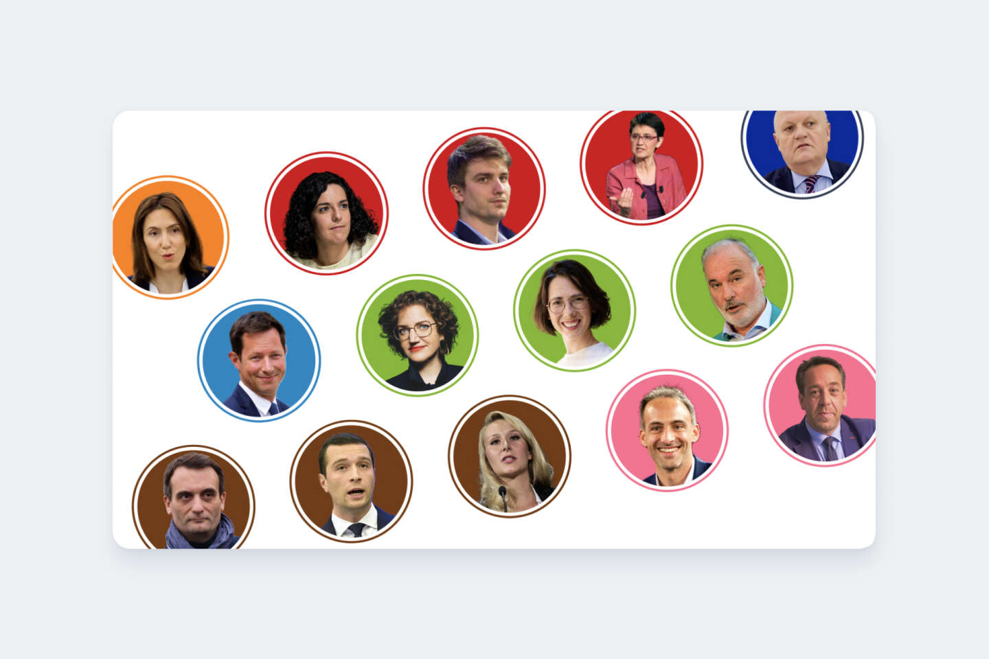 بالنسبة للأحزاب الكبرى، فإن رؤساء القائمة هم في أغلب الأحيان أعضاء البرلمان الأوروبي المنتهية ولايتهم، مثل فاليري هاير (النهضة)، وفرانسوا كزافييه بيلامي (الجمهوريون)، وجوردان بارديلا (التجمع الوطني)، ورافاييل غلوكسمان (الحزب الاشتراكي – المكان العام)، مانون أوبري (La France insoumise) أو ماري توسان (Les Ecoologists).