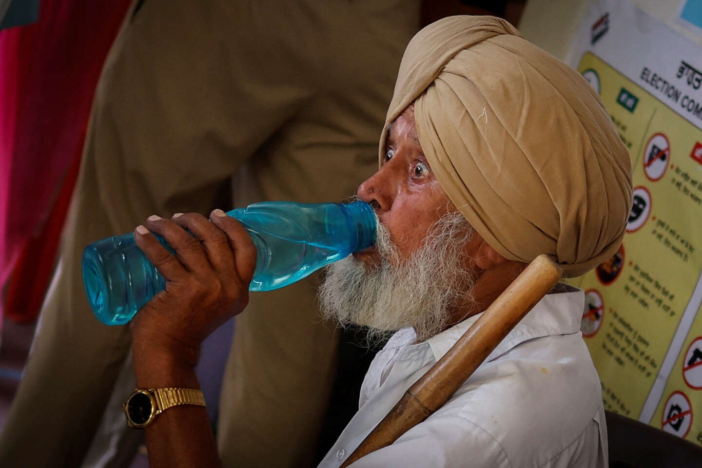رجل يشرب الماء أثناء انتظاره خارج مركز الاقتراع للإدلاء بصوته في مركز اقتراع خلال المرحلة السابعة والأخيرة من الانتخابات العامة، في منطقة فريدكوت، البنجاب، الهند، في 1 يونيو 2024. عدنان عبيدي / رويترز