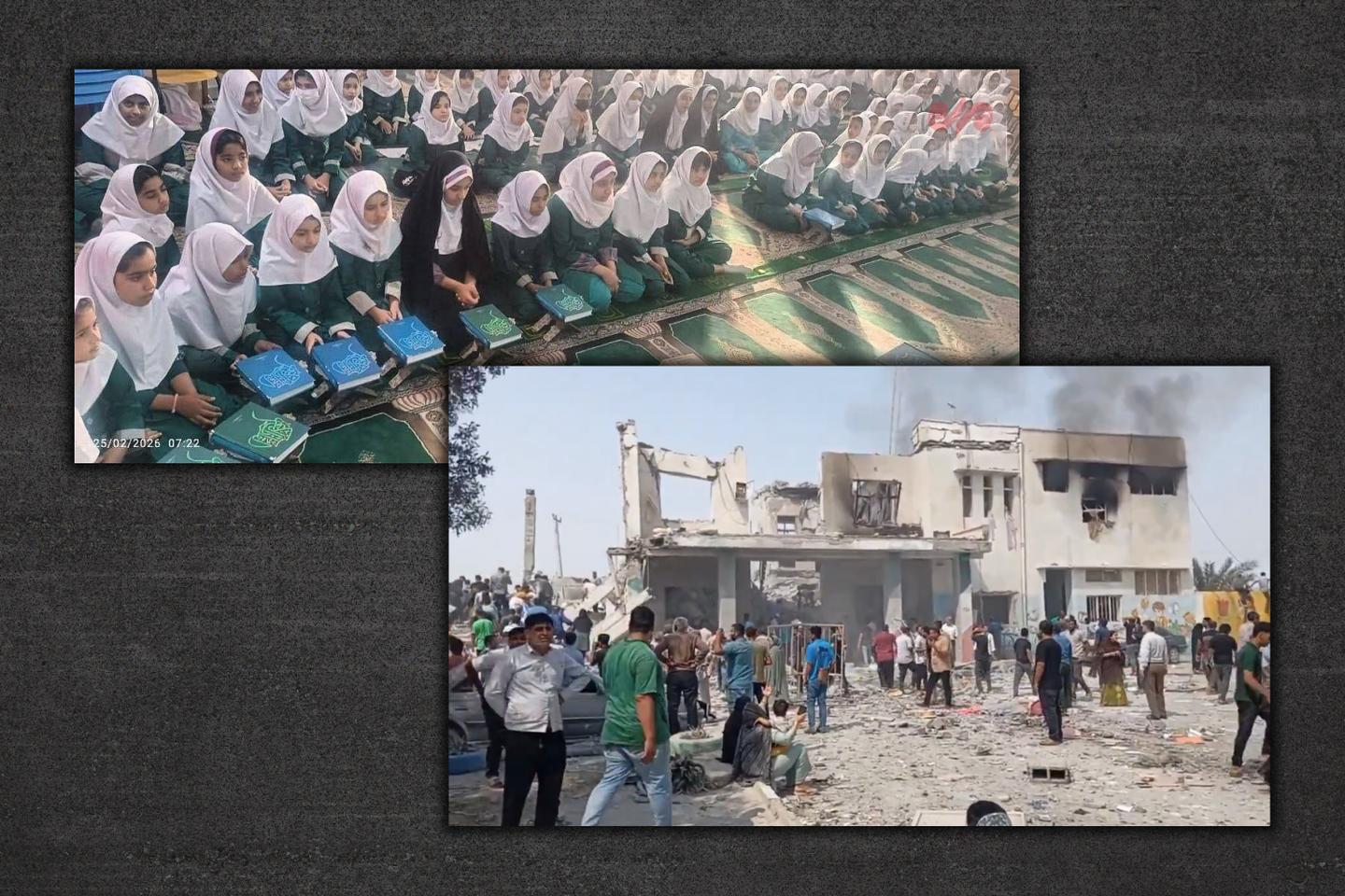 وفي 28 فبراير 2026، تظهر نفس السجادة الخضراء في مقاطع فيديو لأنقاض المدرسة، التي يتم استخراج جثث الأطفال منها. وقد تم تدمير قاعة الصلاة والعديد من الفصول الدراسية، أي ثلثي المبنى، بالكامل، بعد ساعات فقط من بدء حملة القصف الإسرائيلية الأمريكية على إيران.